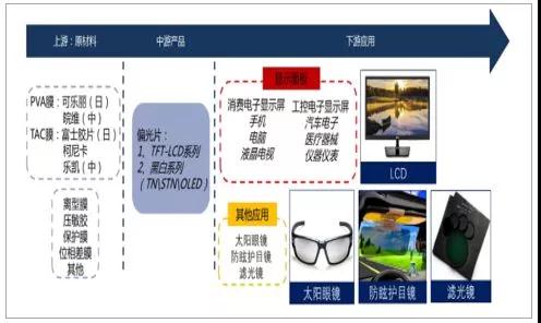 偏光片下游:應用廣泛,顯示面板是主要應用場(chǎng)景。 偏光片被廣泛應用于消費類(lèi)及工控類(lèi)電子顯示屏面板,如手機,電腦,液晶電視,汽車(chē)電子,醫療器械及儀器儀表等,其他應用場(chǎng)景還包括太陽(yáng)眼鏡,防眩護目鏡,攝影設備的濾光鏡,光量控制器等。