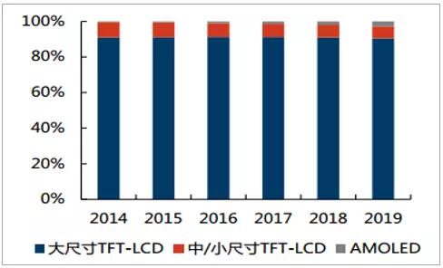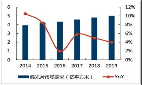 TFT-LCD 帶動(dòng)偏光片需求增長(cháng),大尺寸 TFT-LCD 用偏光片仍是主流。 偏光片是 TFT-LCD 成像不可或缺的組件,其市場(chǎng)需求的增長(cháng)主要由 TFT-LCD 的需求主導,全球偏光片市場(chǎng)需求面積有望在 2019 年達到 5億平方米,其中,大尺寸 TFT-LCD 仍是偏光片需求主要來(lái)源,貢獻 80%以上的需求。