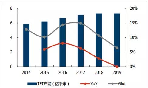 緊跟需求,全球偏光片產(chǎn)能穩步提升,供需結構相對穩定。 在市場(chǎng)需求的帶動(dòng)下,全球偏光片產(chǎn)能逐步提升,據預測, 2019 年全球偏光片產(chǎn)能有望達到 7.28億平方米, 同時(shí), Glut 值((供給-需求) /需求)為 6.4%,供給略高于需求,供需結構較為良好。