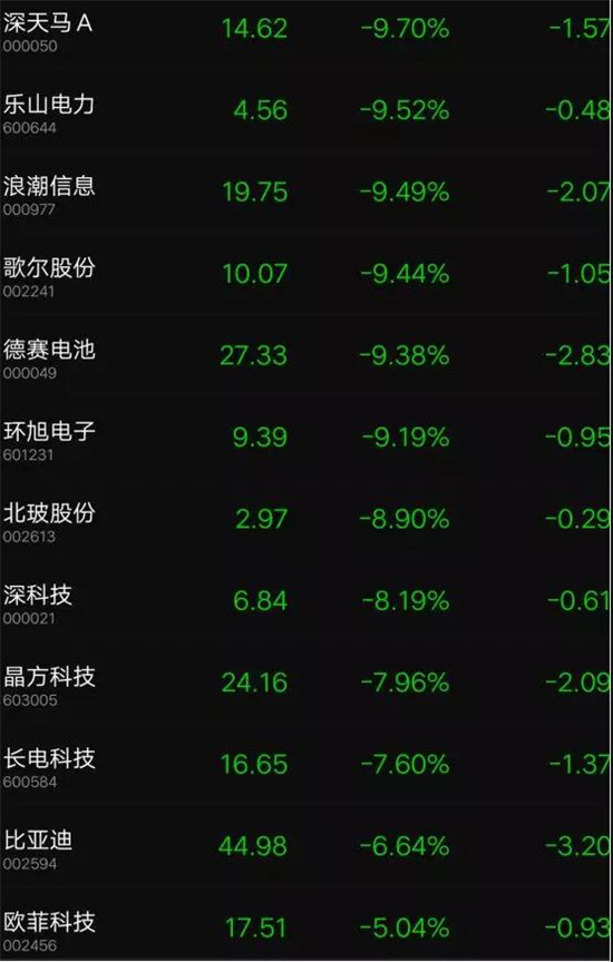 此外,深天馬A、歌爾股份、德賽電池、環(huán)旭電子、北玻股份、晶方科技、長電科技、比亞迪、歐菲科技、欣旺達、大族激光、江豐電子、立訊精密、精測電子、勁拓股份等也大跌!