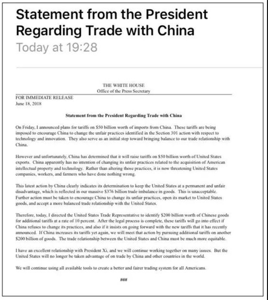 據(jù)手機報在線此前報道,原本已經(jīng)和解的中美貿(mào)易大戰(zhàn),在美國的出爾反爾之下,進一步惡化升級。6月15日,據(jù)外媒報道稱,美國政府發(fā)布了加征關(guān)稅的商品清單,將對從中國進口的約500億美元商品加征25%的關(guān)稅,其中對約340億美元商品自2018年7月6日起實施加征關(guān)稅措施,同時對約160億美元商品加征關(guān)稅開始征求公眾意見。