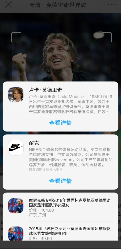 作為全民狂歡,世界杯帶給眾人的樂趣不止是拍照。不管你是真球迷還是路人粉,vivo NEX總會扮演著你的世界杯“智囊團(tuán)”的角色,為你的觀賽體驗保駕護(hù)航。32支球隊,736名球員,對于非專業(yè)的普通球迷而言在看比賽的時候腦子一定有很多的問號:“這個法國年輕前鋒是誰?”“克羅地亞中場踢的真好,他叫什么?”這個時候vivo NEX的Jovi智慧識圖可以幫到球迷,在任意應(yīng)用界面,按下AI獨立按鍵,Jovi會告訴你法國隊在世界杯史上最年輕的進(jìn)球球員叫姆巴佩,那個克羅地亞中場核心是本場比賽的非凡之星莫德里奇,中國球迷會叫他“魔笛”。如果需要的話,Jovi還會告訴你“魔笛”身上穿的球衣賣多少錢,在哪兒可以買到??梢哉f有了Jovi智慧識圖,為球迷也可以讓自己變得專業(yè)起來,世界杯賽場不再只是梅西、C羅和“這是誰”。