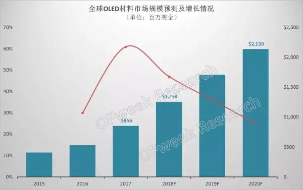 根據(jù)OFweek產(chǎn)業(yè)研究院數(shù)據(jù),2017年全球OLED發(fā)光材料市場(chǎng)規(guī)模為4.04億美元,通用材料為4.52億美元。預(yù)計(jì)2018年將分別增長(zhǎng)至5.6億美元和6.98億美元。