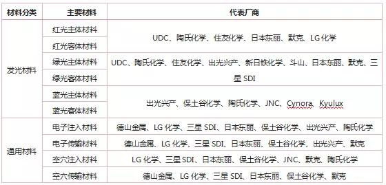 OLED材料主要包括兩部分:發(fā)光材料和基礎(chǔ)材料,兩者占OLED屏幕物料成本的30%左右。OLED發(fā)光材料主要包括紅光主體/客體材料、綠光主體/客體材料、藍(lán)光主體/客體材料等。OLED通用材料,主要包括電子傳輸層ETL、電子注入層EIL、空穴注入層HIL、空穴傳輸層HTL、空穴阻擋層HBL、電子阻擋層EBL等,隨著器件結(jié)構(gòu)的優(yōu)化,材料的種類在不斷變多。其中有機(jī)發(fā)光層材料和傳輸層材料為OLED的關(guān)鍵材料。