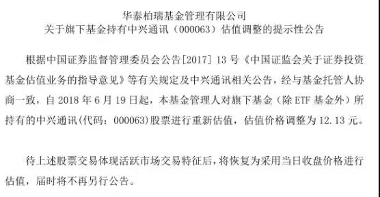 同樣下調(diào)中興通訊估值的還有華泰柏瑞基金,根據(jù)華泰柏瑞基金今日發(fā)布的關(guān)于旗下基金所持證券調(diào)整估值價(jià)的公告:根據(jù)中國(guó)證券監(jiān)督管理委員會(huì)公告[2017] 13號(hào)《中國(guó)證監(jiān)會(huì)關(guān)于證券投資基金估值業(yè)務(wù)的指導(dǎo)意見(jiàn)》等有關(guān)規(guī)定及中興通訊相關(guān)公告,經(jīng)與基金托管人協(xié)商一致,自2018年6月19日起,本基金管理人對(duì)旗下基金(除ETF基金外)所持有的中興通訊(代碼:000063)股票進(jìn)行重新估值,估值價(jià)格調(diào)整為12.13元。