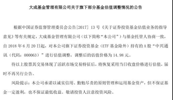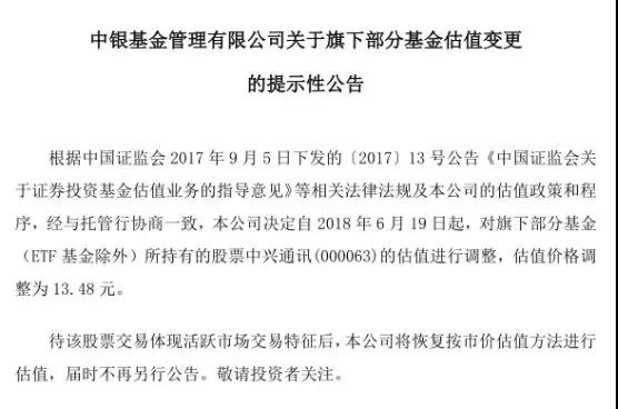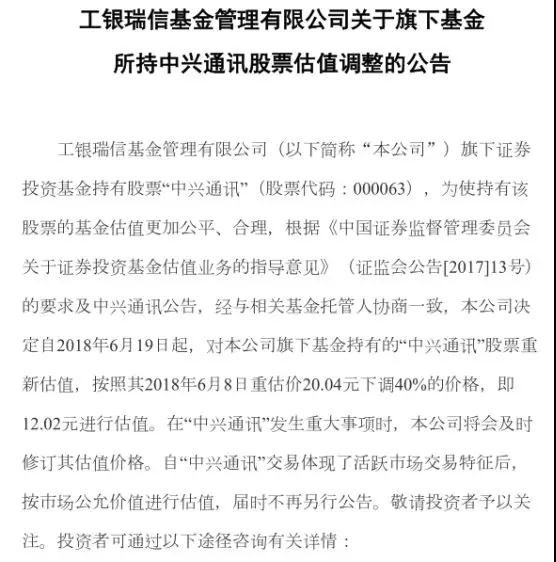 而在此期間,多家基金公司對(duì)中興通訊股票的估值進(jìn)一步調(diào)整,總體是進(jìn)一步下調(diào)。部分基金已將中興通訊估值下調(diào)至12.02元。富國(guó)基金近日公告稱(chēng),自2018年6月20日起,對(duì)旗下基金持有的“中興通訊”股票進(jìn)行估值調(diào)整,按照12.02元進(jìn)行估值。