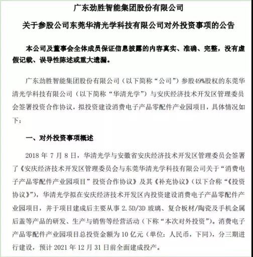 7月10日,據(jù)勁勝智能發(fā)布公告表示,公司參股公司東莞華清光學(xué)科技有限公司(以下簡稱“華清光學(xué)”)擬投資10億元在安徽省安慶經(jīng)濟(jì)技術(shù)開發(fā)區(qū)投資建設(shè)消費(fèi)電子產(chǎn)品零配件產(chǎn)業(yè)園項(xiàng)目,該項(xiàng)目主要從事2.5D/3D玻璃、復(fù)合板材/陶瓷及手機(jī)金屬后蓋等產(chǎn)品的研發(fā)、生產(chǎn)與銷售。