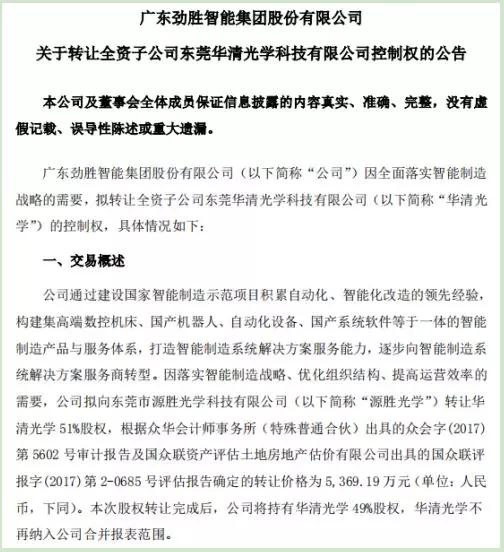 值得注意的是,其實(shí)華清光學(xué)在2017年8月份之前,還是勁勝智能全資子公司,2017年8月底,勁勝智能發(fā)布公告表示,因落實(shí)智能制造戰(zhàn)略、優(yōu)化組織結(jié)構(gòu)、提高運(yùn)營效率的需要,公司將華清光學(xué)51%的股權(quán)以5369.19萬元的價格轉(zhuǎn)讓給東莞市源勝光學(xué)科技有限公司,轉(zhuǎn)讓完成后,公司持有華清光學(xué)股權(quán)下降到49%,華清光學(xué)不再納入公司合并報表范圍內(nèi)!