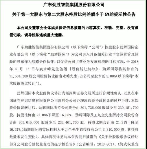5月17日晚間,其再次發(fā)布《關(guān)于第一大股東與第二大股東持股比例差額小于5%的提示性公告》的公告:勁勝智能控股股東勁輝國際為公司引入具備相關(guān)行業(yè)豐富經(jīng)營管理經(jīng)驗(yàn)的股東作為戰(zhàn)略合作伙伴,以促進(jìn)公司主營業(yè)務(wù)發(fā)展和戰(zhàn)略目標(biāo)實(shí)現(xiàn),于2018年5月17日與袁永峰先生簽署《股份轉(zhuǎn)讓協(xié)議》,勁輝國際將其持有的71,584,300股公司股份轉(zhuǎn)讓給袁永峰先生,占公司總股本的5.00%。