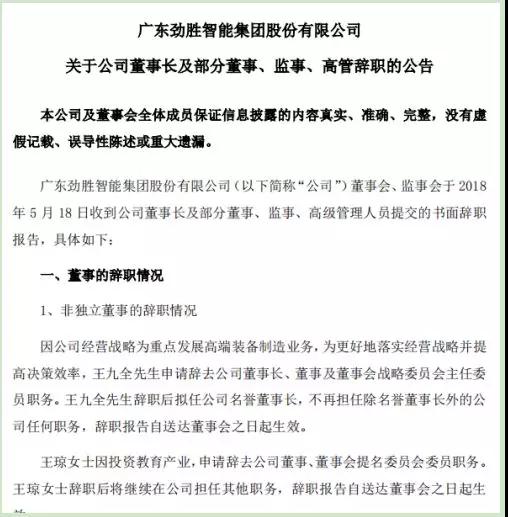 5月21日,勁勝智能再次發(fā)布公告表示,因公司經(jīng)營戰(zhàn)略為重點(diǎn)發(fā)展高端裝備制造業(yè)務(wù),為更好地落實(shí)經(jīng)營戰(zhàn)略并提高決策效率,王九全先生申請辭去公司董事長、董事及董事會戰(zhàn)略委員會主任委員職務(wù)。王九全先生辭職后擬任公司名譽(yù)董事長,不再擔(dān)任除名譽(yù)董事長外的公司任何職務(wù),辭職報告自送達(dá)董事會之日起生效。