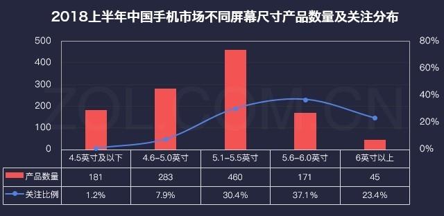 ZDC數據顯示,2018上半年千余款主流在售機型中,屏幕尺寸為5.1-5.5英寸的機型數量最多,達460款,但從用戶(hù)關(guān)注度來(lái)看,5.6-6.0英寸屏幕的機型最受青睞,獲得37.1%的關(guān)注比例,占據主流。