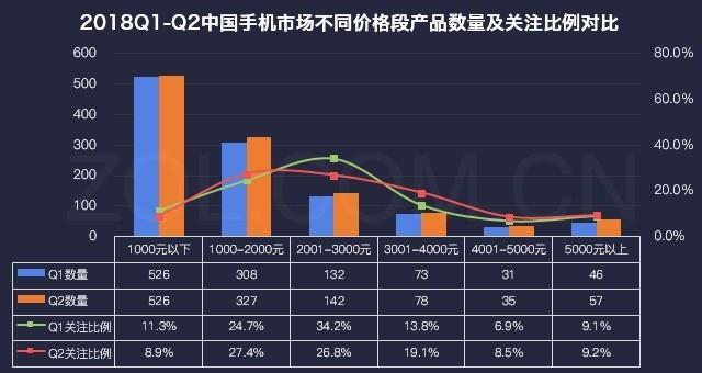 2018Q1-Q2中國手機市場(chǎng)不同價(jià)格段產(chǎn)品數量及關(guān)注比例對比