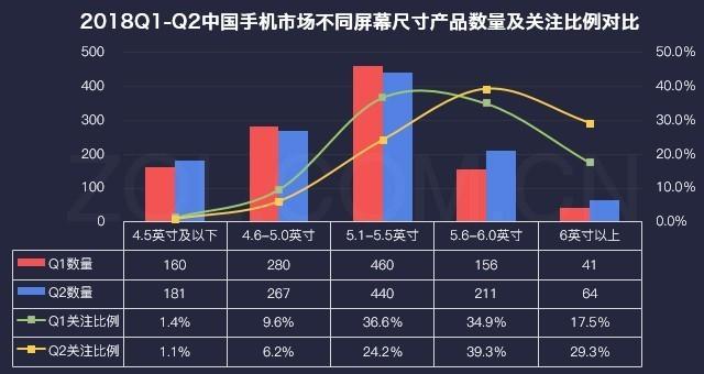 2018Q1-Q2中國手機市場(chǎng)不同屏幕尺寸產(chǎn)品數量及關(guān)注比例對比