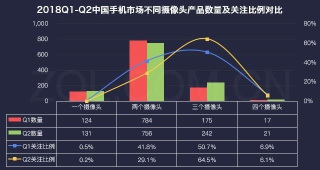 2018Q1-Q2中國手機市場(chǎng)不同攝像頭產(chǎn)品數量及關(guān)注比例對比