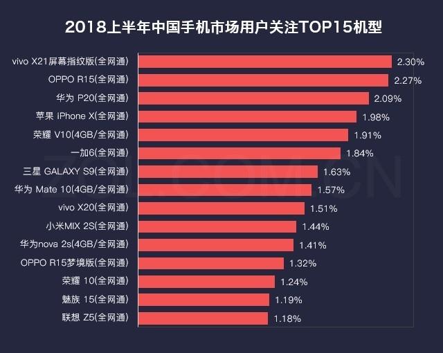 2018上半年中國手機市場(chǎng)用戶(hù)關(guān)注TOP15機型