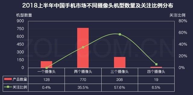 2018上半年中國手機市場(chǎng)不同攝像頭機型數量及關(guān)注比例分布
