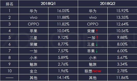 (二)2018Q1-2018Q2品牌格局對比:前三甲穩定,榮耀、一加加速上升