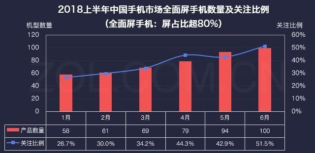 2018上半年中國手機市場(chǎng)全面屏手機數量及關(guān)注比例(全面屏手機:屏占比超80%)