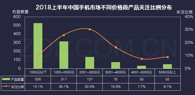 2018上半年中國手機市場(chǎng)不同價(jià)格段產(chǎn)品關(guān)注比例對比