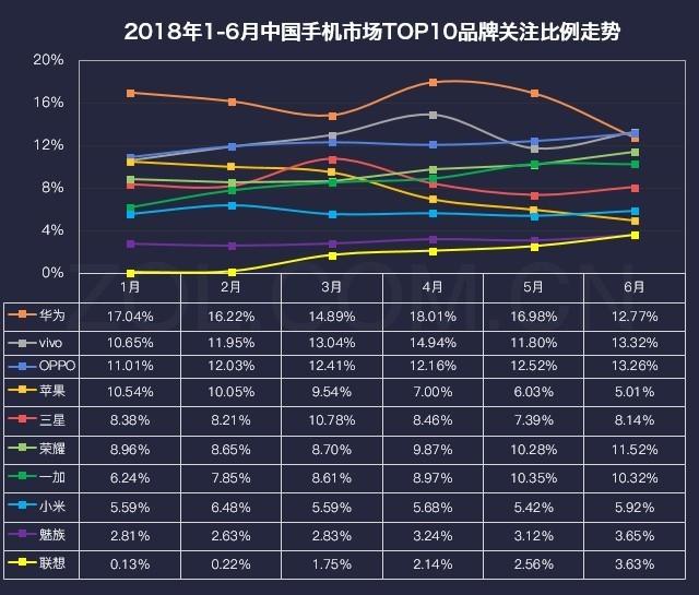 2018年1-6月中國手機市場(chǎng)TOP10品牌關(guān)注比例走勢對比