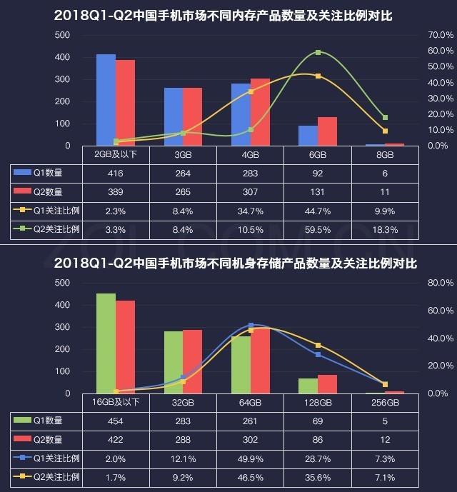 2018Q1-Q2中國手機市場(chǎng)不同內存/機身存儲產(chǎn)品數量及關(guān)注比例對比