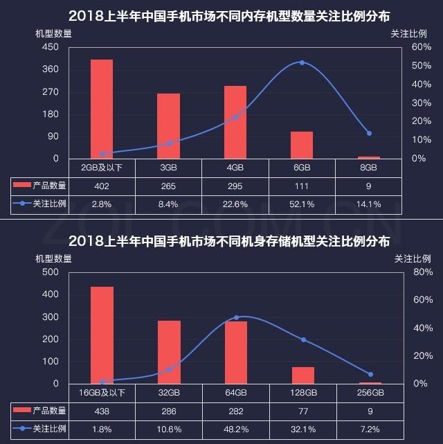 2018上半年中國手機市場(chǎng)不同內存/機身存儲機型關(guān)注比例對比