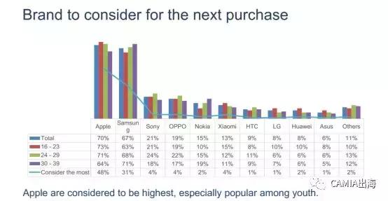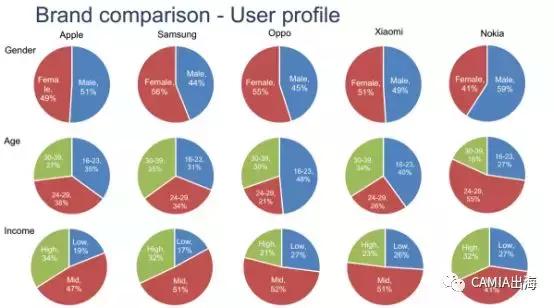 在用戶(hù)群體方面,三星女性比例最高,為56%,OPPO在16~23歲年齡段的年輕人比例高達48%,蘋(píng)果的高收入人群比例為34%,高于諾基亞、三星等手機廠(chǎng)商。
