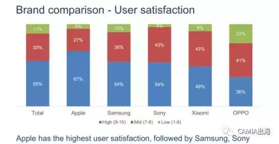 在用戶(hù)滿(mǎn)意度方面,蘋(píng)果的用戶(hù)滿(mǎn)意度最高,其次是三星、索尼、小米、OPPO
