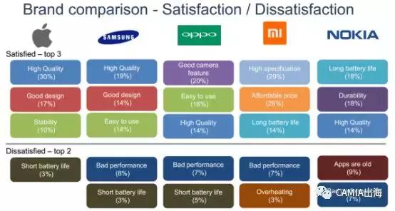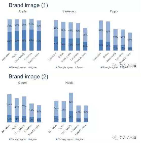在品牌形象方面,三星深受年齡層30-40歲的男性歡迎,蘋(píng)果給人的印象是高大上,OPPO在創(chuàng )意和時(shí)尚方面高于其他的項目,不少人對于諾基亞的第一反應是質(zhì)量不錯,看來(lái)諾基亞以前能砸核桃的傳聞一直被人相信。