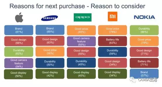 在選擇購買(mǎi)各大手機品牌的理由方面,買(mǎi)蘋(píng)果三星的人大多沖著(zhù)品牌去的,至于買(mǎi)OPPO、小米、諾基亞的人則是看上了它們的價(jià)格厚道。(校對/羅明)