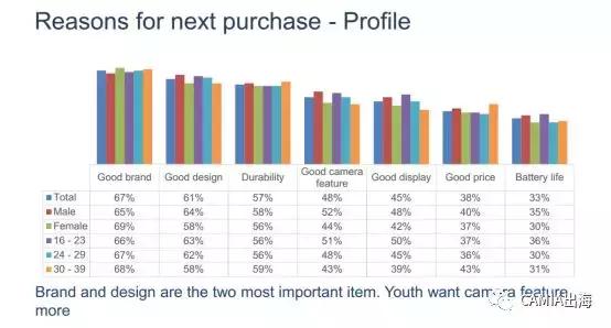 在購買(mǎi)手機考慮的因素方面,大多數人傾向于手機品牌與外觀(guān)設計,對于手機的拍照,各年齡層次的人都很看重。