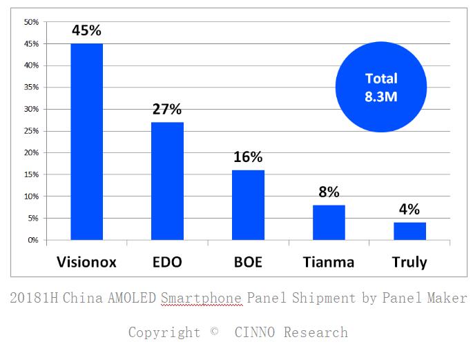 維信諾出貨390萬片, 占大陸AMOLED手機(jī)面板出貨量的45%。