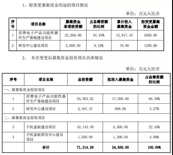 這兩個項目均屬于2018年7月31號發(fā)布的《變更部分募集資金用途的公告》內(nèi)容部分。智動力表示,為進一步提高募集資金的使用效率,公司擬根據(jù)未來發(fā)展戰(zhàn)略以及消費電子行業(yè)近年的實際發(fā)展狀況并從企業(yè)經(jīng)營實際出發(fā),變更部分募集資金投資項目的建設內(nèi)容或用途。
