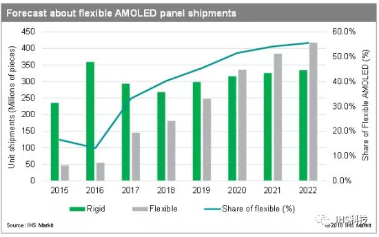 IHS Markit的研究分析顯示,柔性AMOLED面板出貨量預計將在2020年達到3.357億,突破剛性AMOLED面板3.159億的出貨量。柔性AMOLED面板預計將占AMOLED面板總出貨量的52%,而在2018年僅為38.9%。