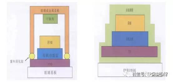 圖7:以玻璃為襯底和以玻璃或金屬蓋板封裝的OLED硬屏(左)與以柔性聚合物材料為基板和以單層或多層薄膜材料封裝的OLED柔屏(右)結(jié)構(gòu)圖