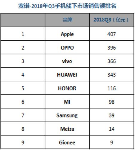 第三季度線(xiàn)下銷(xiāo)售額部分,蘋(píng)果407億元排名第一,二到四名分別為OPPO(396億)、vivo(366億)、華為(343億)。榮耀銷(xiāo)售額為116億元,位居國內手機線(xiàn)下市場(chǎng)第五,超過(guò)小米和魅族線(xiàn)下銷(xiāo)售額之和,拿下互聯(lián)網(wǎng)手機第一。