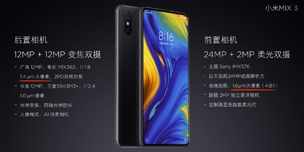 小米MIX 3主相機(jī)保持了和小米MIX 2S一樣的配置,采用1200萬(廣角,索尼IMX363,f/1.8,1.4μm,2PD雙核對焦)+1200萬(長焦,三星S5K3M3+,f/2.4,1.0μm像素)后置變焦雙攝,支持光學(xué)變焦、四軸光學(xué)防抖、人像模式、AI場景相機(jī)。