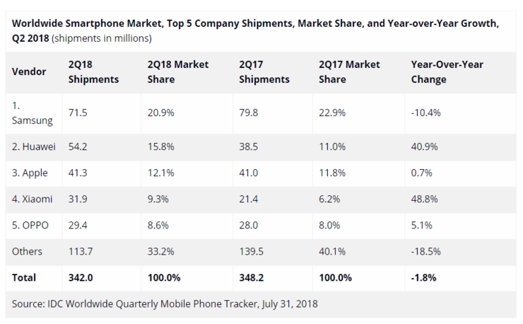2018年11月1日,IDC發(fā)布了2018年第三季度全球智能手機出貨量報告。報告顯示,在全球智能手機銷量下降6%的情況下,華為以4690萬部的出貨量和32.9%的同比增長率,再次獲得全球第二的名次。