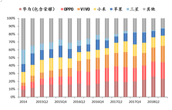 從上圖中可以看到,在2014年的時(shí)候市場(chǎng)基本上還是“百家爭(zhēng)鳴”的階段,當(dāng)時(shí)市場(chǎng)上可以看到各種各樣的手機(jī)品牌,最強(qiáng)的華為、OPPO、VIVO、小米、蘋果、三星,加起來(lái)占據(jù)市場(chǎng)份額不足60%而到了2018年的第三季度,前5個(gè)公司已經(jīng)占據(jù)整個(gè)行業(yè)90%的份額。這種跡象已經(jīng)充分反映行業(yè)的現(xiàn)狀。