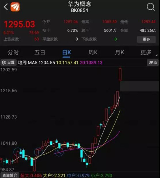 2018年12月底,華為概念股板塊正式建立,進(jìn)入2019年2月份開始至今的25天時間中,華為概念股進(jìn)入瘋狂暴漲狀態(tài),從1月31日的976點上漲到目前的1295點,上漲幅度達(dá)到了32.68%。