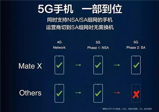 5G架構(gòu)包括NSA(Not-Standalone,非獨立組網(wǎng))和SA(Standalone,獨立組網(wǎng)),第一階段是NSA,也可以稱為過渡5G,第二階段是SA,是5G網(wǎng)絡(luò)架構(gòu)的終極形態(tài)。選擇NSA架構(gòu)可以在初期幫助運營商實現(xiàn)更快速的5G建網(wǎng),但后期為了實現(xiàn)連續(xù)覆蓋以及支持全部的5G場景,向SA的推進(jìn)勢在必行。搭載巴龍5000的HUAWEI Mate X可以同時支持NSA和SA組網(wǎng)方式,不管運營商是NSA組網(wǎng)還是SA組網(wǎng),均可正常接入,是一“部”到位的5G手機(jī)。