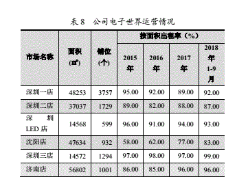 而近年來,華強北“空鋪潮”屢見不鮮。記者從深圳華強集團有限公司2018年度第三期中期票據(jù)信用評級報告中發(fā)現(xiàn),華強集團的電子世界門店多集中在華強北市場,深圳一店共有鋪位3757個,2015年出租率達到95%,后逐年下降,2017年降到89%,2018年的1月至9月有所回升,為92%。深圳二店的鋪位數(shù)量為1729個,2018年1至9月出租率為87%。