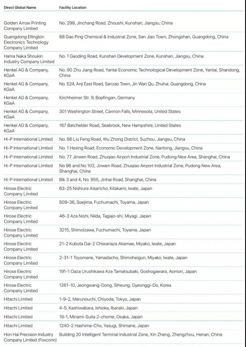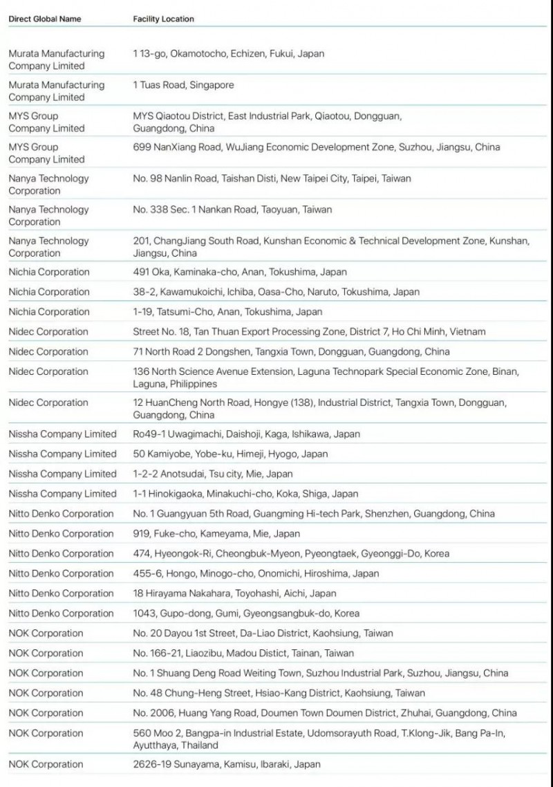 Brady Corporation(貝迪):此前貝迪為蘋果提供精密模切方案,可用于手機解決方案和其他消費類電子解決方案。但隨后被寶德集團收購,所以在最新的這份名單中,并未出現(xiàn)貝迪的名字,無法確定貝迪是否還在為蘋果供應產(chǎn)品!