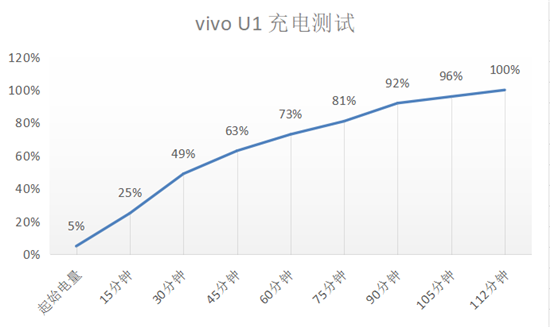 充電速度方面,從5%-100%,采用原裝充電器總耗時(shí)112分鐘。從充電曲線來看,整體充電速度較為平穩(wěn),前30分鐘充進(jìn)49%的電量,在后期沒有出現(xiàn)明顯的功率驟降等情況。面對4030mAh來說,vivo U1提交了一份優(yōu)秀的“答卷”。