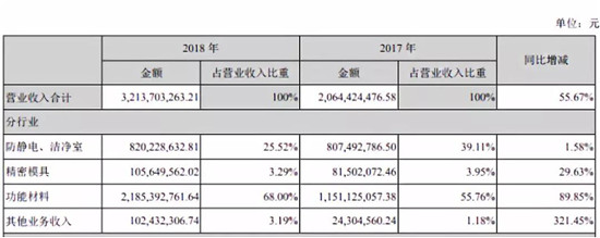 從新綸科技2018年各大業(yè)務(wù)來看,主要有防靜電/潔凈室業(yè)務(wù)和功能材料,前者2018年?duì)I收為8.20億元,與上一年的8.07億元相比提升僅1.58%,占營(yíng)收比重為25.52%;而后者的營(yíng)收則達(dá)到了21.85億元,與上年同期的11.51億元相比同比增長(zhǎng)89.85%,占營(yíng)收比重為68.00%。