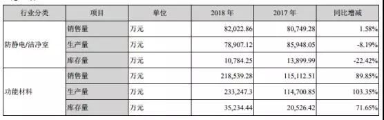 此外,從上述兩種主營(yíng)產(chǎn)品的銷售量也可以看出,功能材料為業(yè)績(jī)?cè)鲩L(zhǎng)點(diǎn)所在,其2018年防靜電/潔凈室的生產(chǎn)量與上年同期相比下降8.19%,而功能材料的生產(chǎn)量與上年同期相比則增長(zhǎng)了103.35%,起源于則在于收購(gòu)的千洪電子主營(yíng)業(yè)務(wù)就是功能材料。
