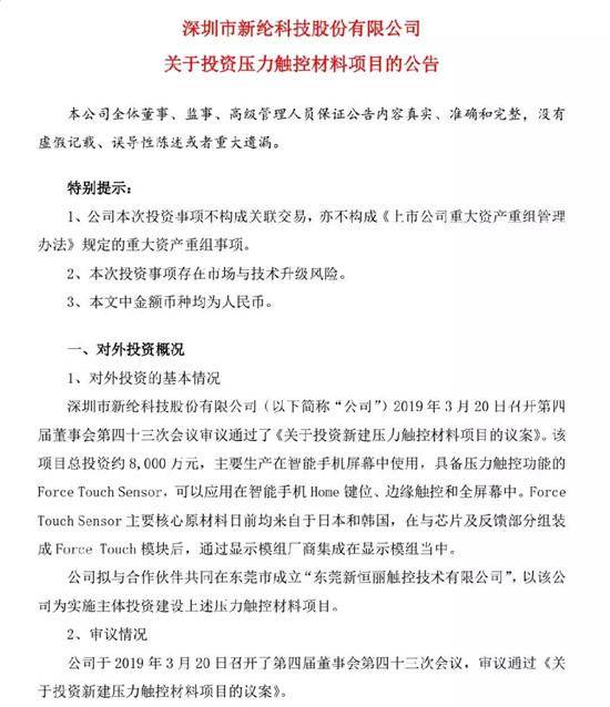 到了3月21日,新綸科技發(fā)布公告表示進(jìn)軍壓力觸控領(lǐng)域!公告表示:新綸科技2019年3月20日召開第四屆董事會(huì)第四十三次會(huì)議審議通過了《關(guān)于投資新建壓力觸控材料項(xiàng)目的議案》。該項(xiàng)目總投資約8000萬元,主要生產(chǎn)在智能