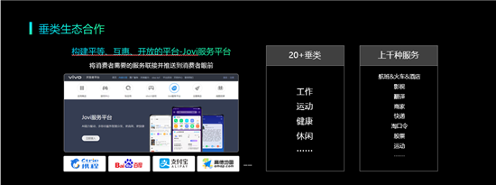 隨著移動互聯(lián)網(wǎng)下數(shù)字化產(chǎn)業(yè)形態(tài)的不斷發(fā)展,vivo將今年的重點(diǎn)聚焦于運(yùn)動、健康、工作、休閑等幾乎覆蓋了當(dāng)前移動互聯(lián)網(wǎng)業(yè)務(wù)生態(tài)中最具活躍度和顯性價值區(qū)域的四大應(yīng)用場景。即將上線的Jovi服務(wù)平臺,目前已和攜程、百度、支付寶、高德等重要合作伙伴展開深度合作,成功接入20多個品類,支持上千種的服務(wù),為用戶提供智慧服務(wù)。
