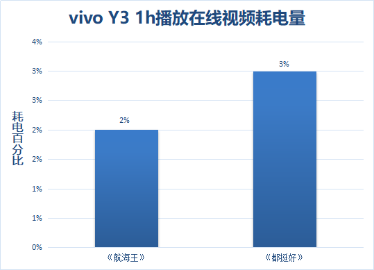 測試結(jié)果顯示,vivo Y3播放《航海王》消耗2%;播放《都挺好》消耗3%,整體消耗5%。這樣的成績對于一塊6.35英寸的水滴大屏來說實(shí)屬難得,從側(cè)面也可以反映出vivo Y3的5000mAh大電池與AI省電技術(shù)的作用。縱觀整體中端市場,vivo Y3的視頻播放表現(xiàn)穩(wěn)居第一梯隊(duì)位置。