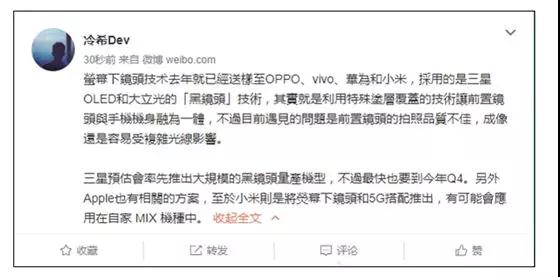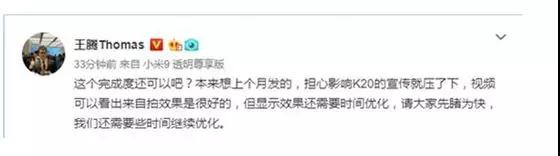 有意思的是,數(shù)小時(shí)后,小米總裁林斌在其微博上公布了小米9屏下攝像頭版,小米公司產(chǎn)品總監(jiān)王騰補(bǔ)充道,這個(gè)視頻本來(lái)是想上個(gè)月發(fā)的,擔(dān)心影響K20的宣傳就壓了下,視頻可以看出自拍效果是很好的,但是顯示效果還需要時(shí)間優(yōu)化,請(qǐng)大家先睹為快,我們還需要些時(shí)間繼續(xù)優(yōu)化。